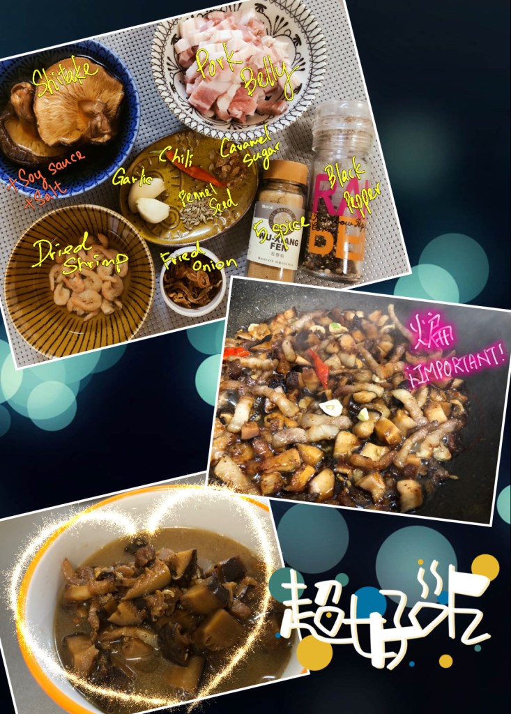 The crucial step to success for this dish is a process called “煸” in Chinese. Basically it is to stir fry some ingredients and spices to draw out the fragrance. I started with the pork belly on medium heat to draw out the lard then slowly add in dried shrimp, shitake, garlic, chili and fennel seeds. Then its the caramelize step using sugar and soy sauce to create appetizing color and layered taste. Rice wine was then added, boil off for a while before water was added. The pot was then simmered for 30~40 mins to let all the taste combine….later salt and pepper was added to finally bring everything together.
