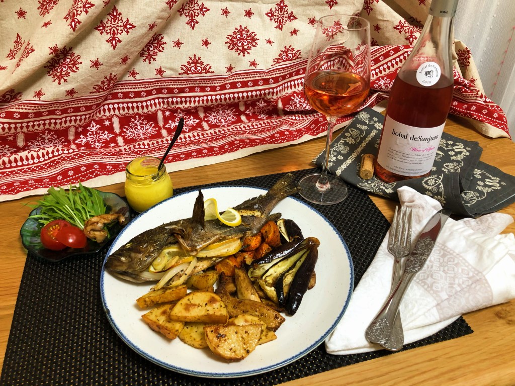 The fish was seasoned with spices, stuffed with lemon cut and garlic then got a olive oil massage before going into the oven. All the vegetable were tossed with thyme, paprika powder, salt & pepper and olive oil before roasting. While waiting for the roast, i made a dipping with aji amarillo paste, mayonnaise and garlic. It was a dipping with Peruvian twist, using the yellow hot pepper.