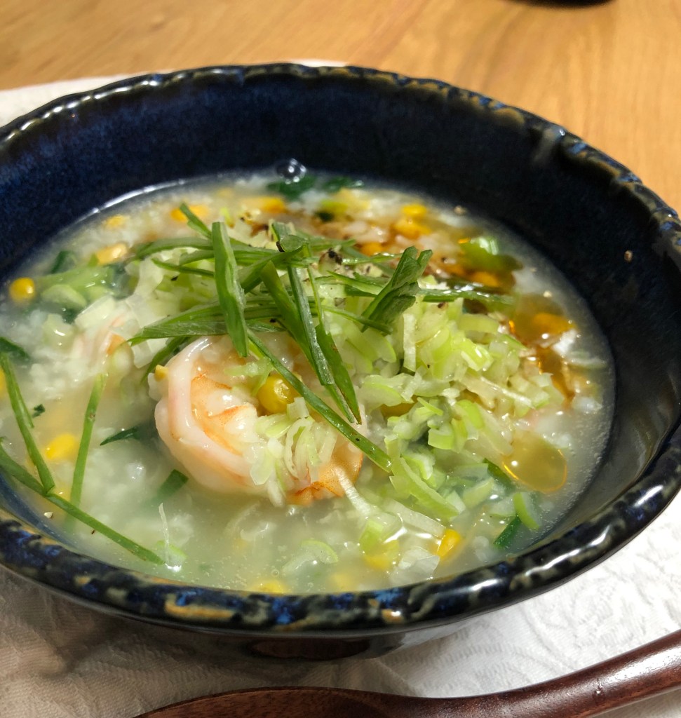 I enjoy adding vegetables in porridge and today i added corn(canned…not the season yet) and green leaf vege. For protein i threw in some prawns, although my preference is normally pork or chicken i used what i have at hand.