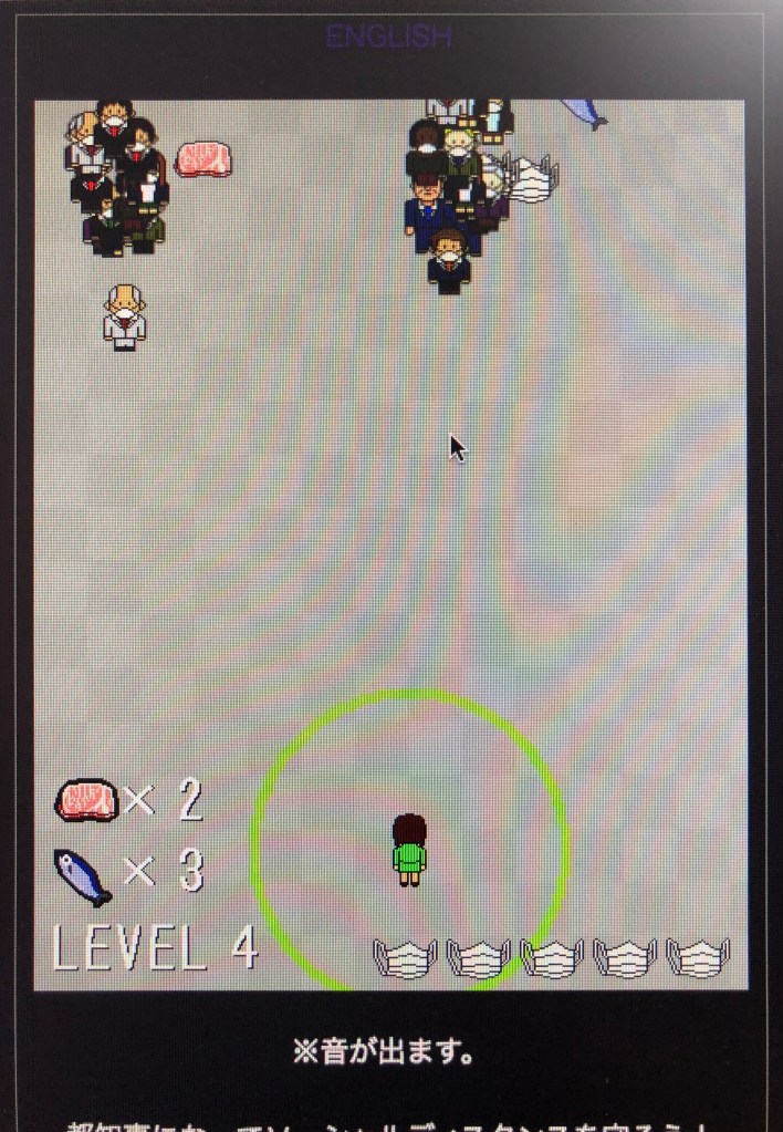 Along the way you will find Mr.Abe(?) handing out masks, and also some meat and fish which has not apparent usage. Click around them could send them your way for faster collection. At higher level, the crowd starts to move around and towards you while your green circle gets bigger. Mr. Abe will be mixed with the crowd so it becomes harder and harder to acquire mask without taking damage. I lose at lvl 7 and ranked B overall, where the game advice me to stay home…