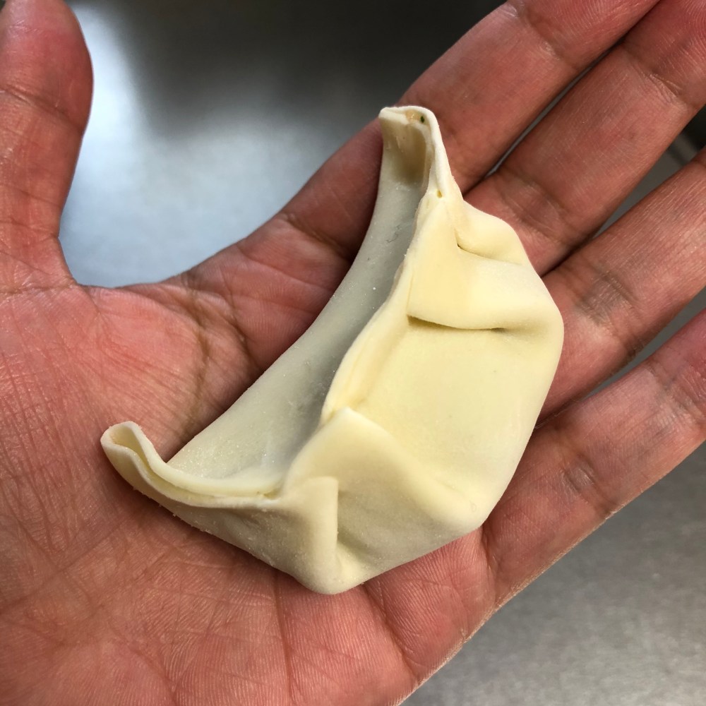 During this time, cilantro and cabbage were finely chopped and only the cabbage need to go through light pickle process with salt to remove water from it. After the vegetable were stirred in, wrapping started. I used store bought dough this time as making it from scratch was slightly too much work. I ended up with 16 big pot stickers as i had 16 pieces fo dough, and some left over filling which i used to make something else on the side.